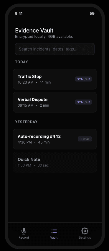 Defense Recorder runs discreetly in the background, continuously capturing audio with intelligent storage management and secure file locking.