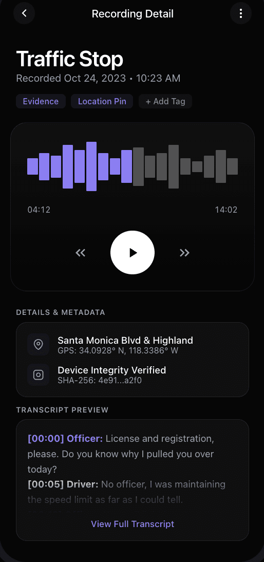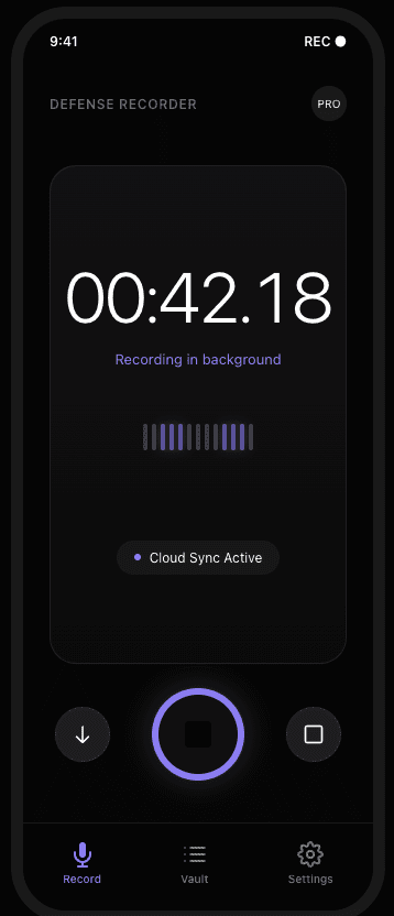 Defense Recorder securely records, stores, and protects audio in the background, so you always have a record when you need it.